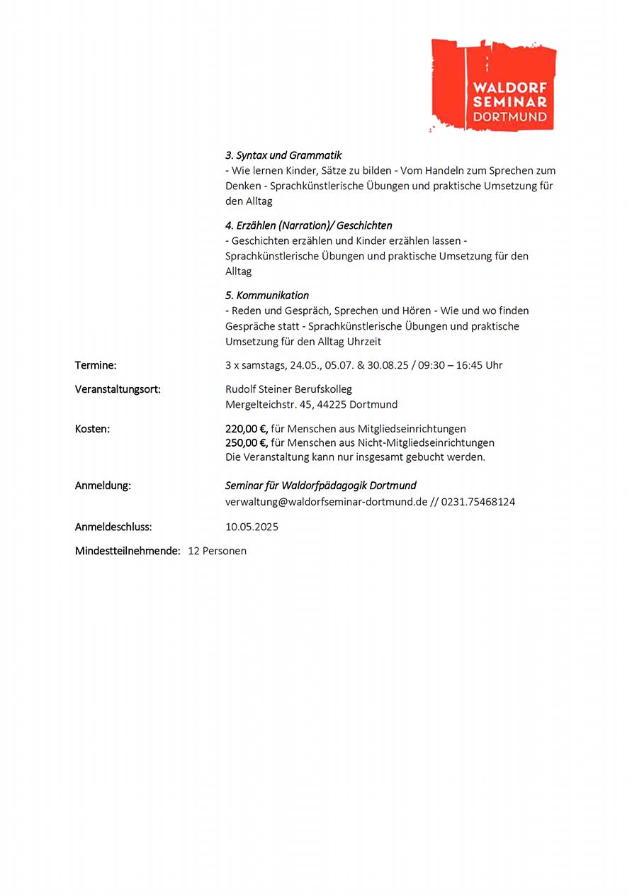 - Seit 2019 Dozentin für Sprachgestaltung am Seminar für Waldorfpädagogik Dortmund